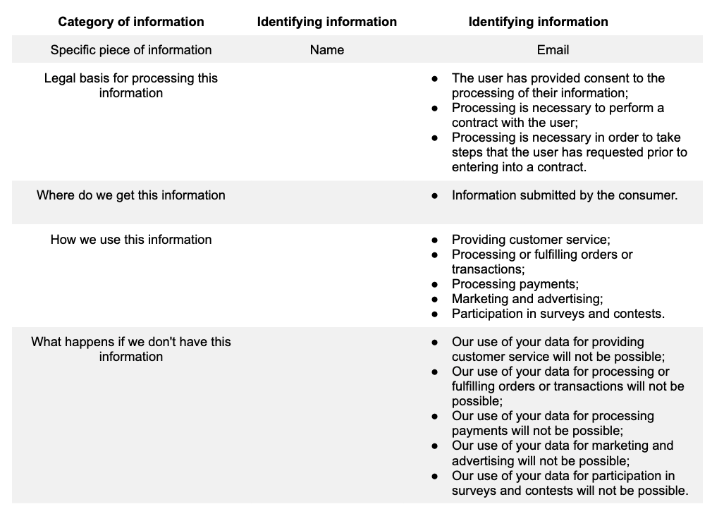 What information we collect, where we get this information, how we use this information, what happens if we don't have it, and the legal basis for processing this information.